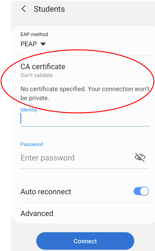 - Under CA certificate, choose “Don’t validate.”