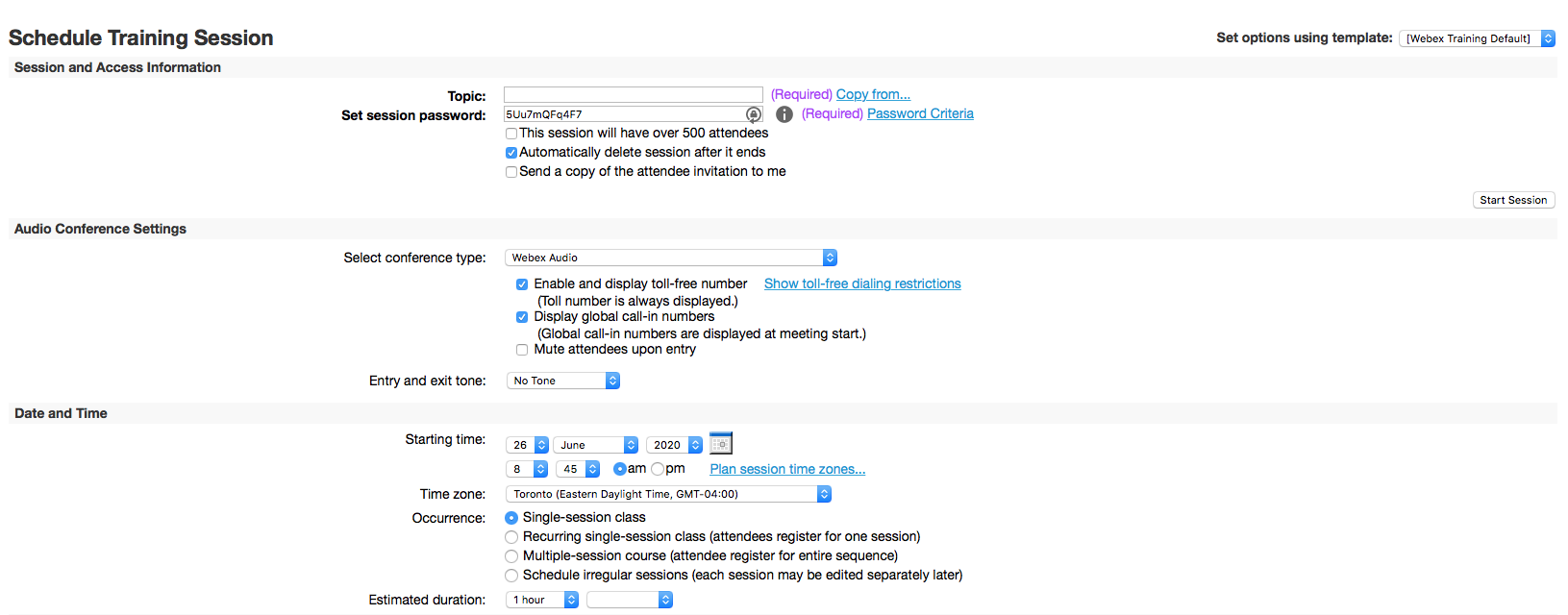 2. Choose an appropriate topic to call your session, and set a password; the password field is required, and attendees must provide the password to join the session.