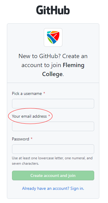 - Verify your email address by entering a launch code, which is sent to your Fleming email address after your GitHub account is created.
