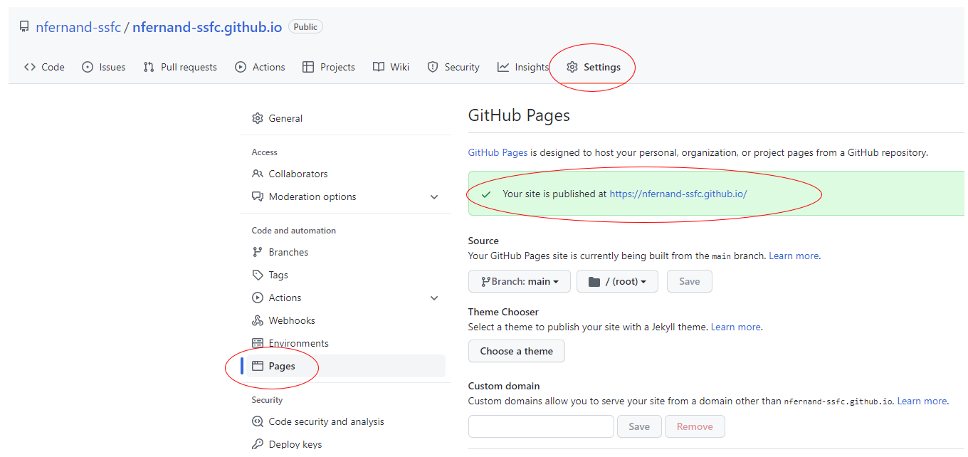 - From the “Settings” tab of your repository, select “Pages,” confirm that your new website is published (should happen within 10 minutes), take note of your new URL, and select it to visit your website.