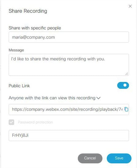 The recording will always be saved in the Webex Cloud. When the recording is ready, the meeting host can access and share the recordings with anyone. The host will receive an email with all the details to share and play the recording.