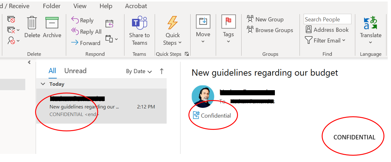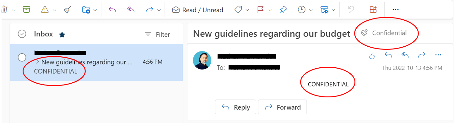 - Know that the recipient(s) will see the following identifications of the applied sensitivity label in Outlook on their computer.